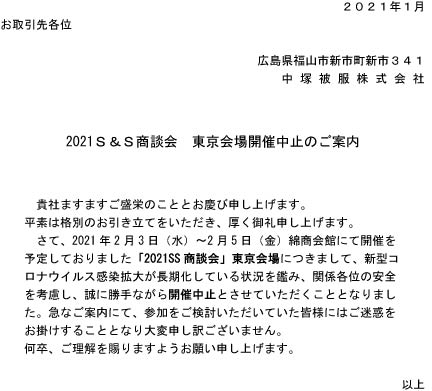 2月3・4・5日と予定しておりました2021SPRING&SUMMER東京商談会の開催が中止となりました。