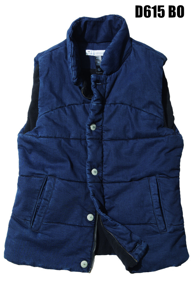 ダウンベストのようなボリューム感があり、 保温性の高い中綿を使用して裏フリースに する事により見た目でも温さを演出してます。 デッキジャケットのテイストに合わせてボタンも dimoテイストならではです。 どのシーンでも着用できるようにシンプルな デザインにしています。 着込むごとにストレッチインディゴデニムによる 独特のヴィンテージ感がでます。 ※D615 BB、D615 BOはバイオ加工をを掛けている為、表示サイズより約ワンサイズ程小さめになっておりますのでご注意下さい。